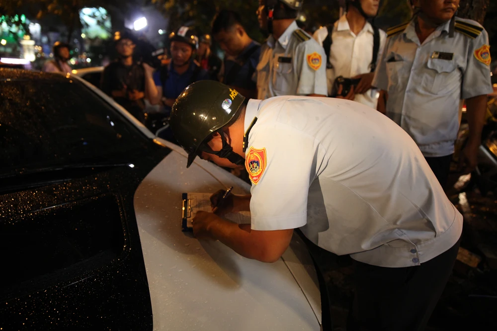 Trên đường Nguyễn Bỉnh Khiêm, tổ công tác đã tiến hành lập biên bản một ô tô vi phạm đậu trên vỉa hè trước tòa nhà Golden Tower (phường Đa Kao, quận 1), mặc dù chủ xe đã cố nài nỉ thông cảm vì có người già nhưng ông Hải vẫn kiên quyết chỉ đạo lập biên bản.