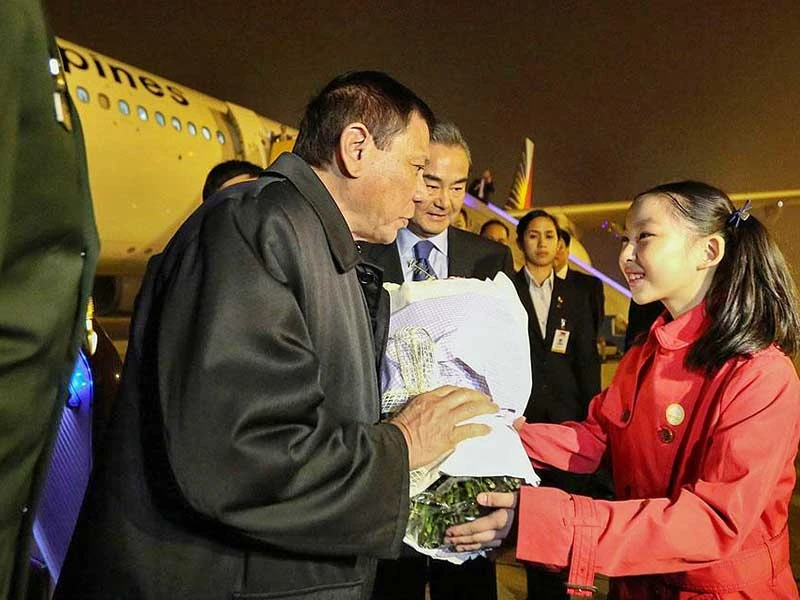 Bộ trưởng Ngoại giao Vương Nghị đón Tổng thống Duterte tới Bắc Kinh tối 18-10. Ảnh: PPD