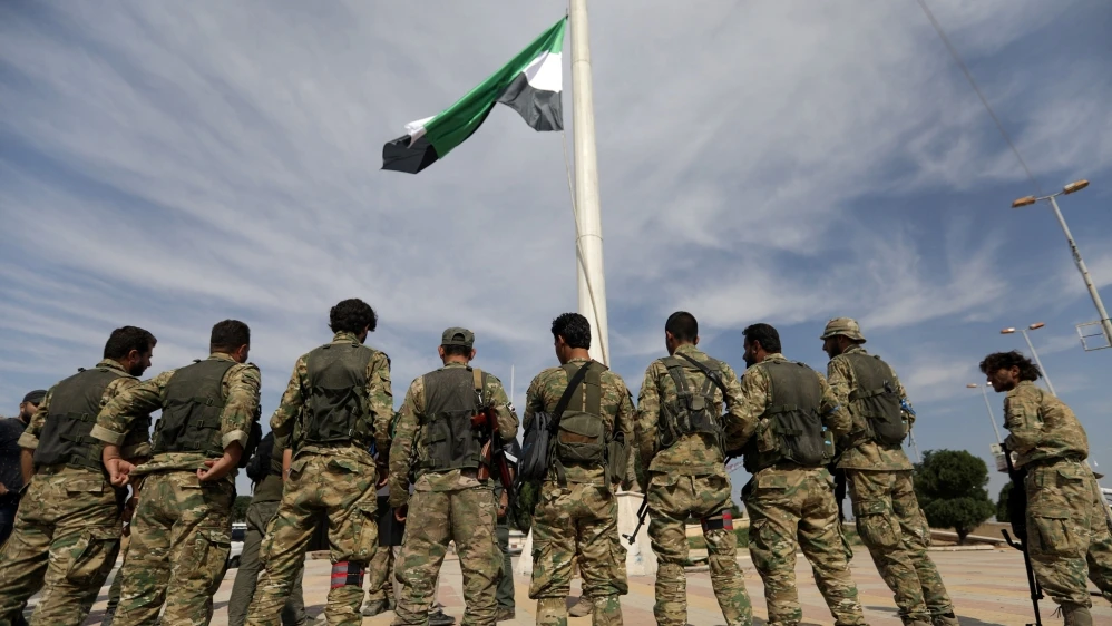 Các tay súng nổi dậy Syria được Thổ Nhĩ Kỳ hậu thuẫn treo cờ của phe đối lập Syria tại thị trấn biên giới Tal Abyad. Ảnh: REUTERS
