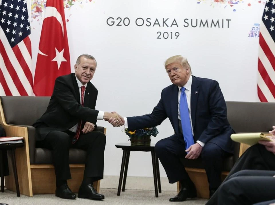 Tổng thống Erdogan và Tổng thống Trump trong cuộc gặp tại Hội nghị G20 tại Nhật Bản ngày 29-6. Ảnh: NTV