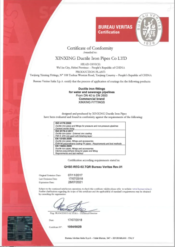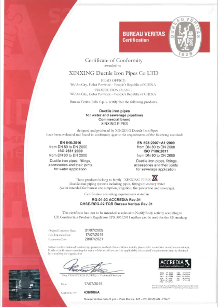 XINXING có thể cung cấp ống gang cầu với các lớp phủ và mối nối đa dạng, đường kính từ DN80-DN2600mm, chiều dài 6-8.15m, sản xuất đồng bộ ống, phụ kiện gang cầu và gioăng. Sản phẩm ống và phụ kiện gang cầu XINXING sản xuất theo tiêu chuẩn quốc tế: ISO2531, BSEN545, ISO4179, ISO8179... Sản phẩm của XINXING thông qua cơ quan chứng nhận WRAS của Anh quốc về xi măng bền sunfat, gioăng cao su, lớp phủ epoxy và sơn tổng hợp, đạt chứng nhận WRAS. Chứng nhận này chứng minh rằng nó có thể tiếp xúc với nước và đảm bảo sự an toàn của nước uống.