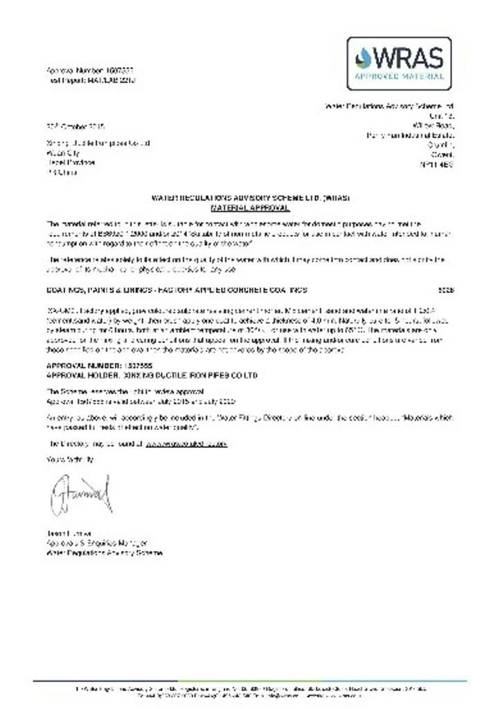 Chứng chỉ WRAS lớp phủ xi măng.