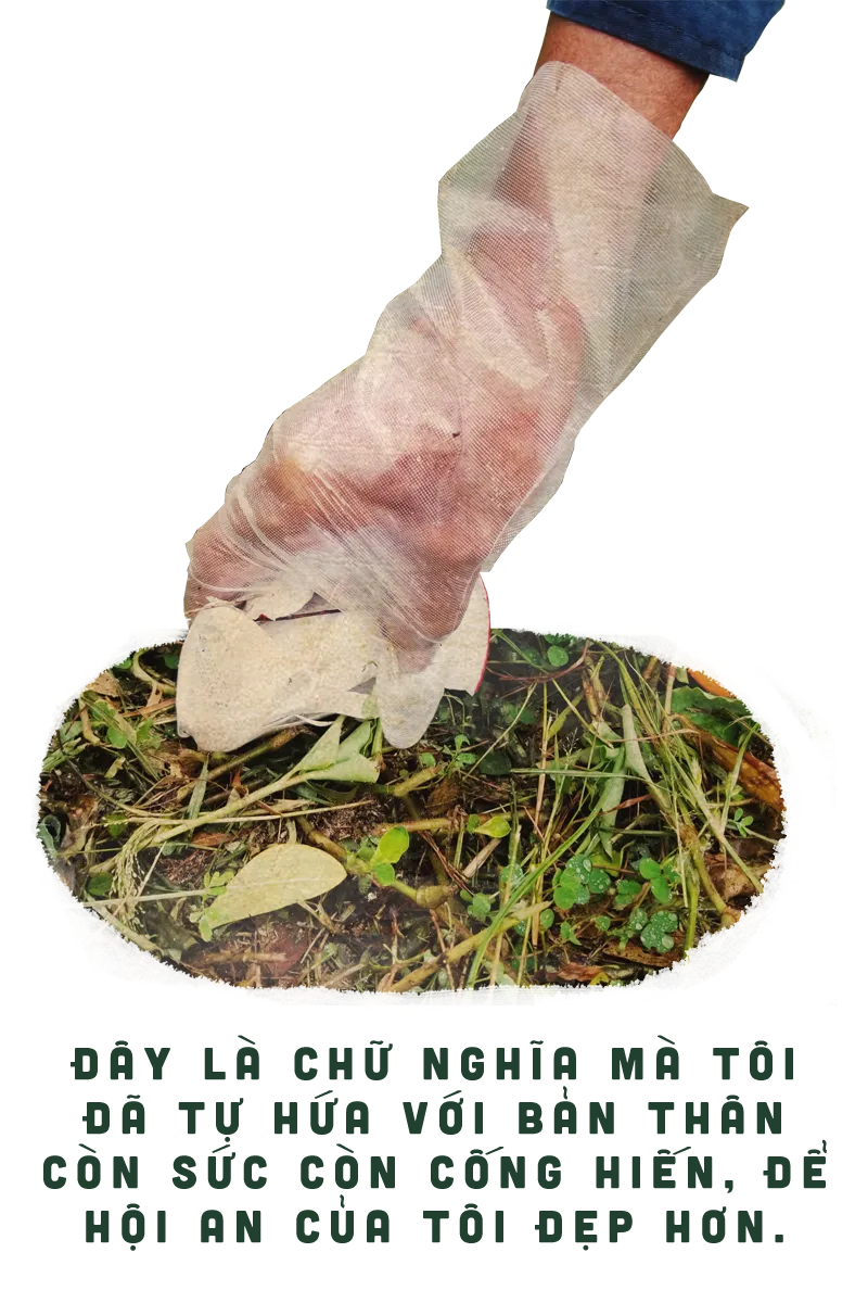 Theo chân ông một lúc, chúng tôi thắc mắc tại sao ông lại làm việc này. Rất nhanh, ông đáp : “Đây là chữ nghĩa mà tôi đã tự hứa với bản thân còn sức còn cống hiến, để Hội An của tôi đẹp hơn”.