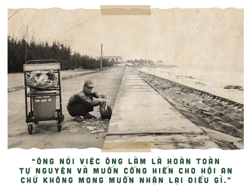 Dáng người gầy gò, làn da đen sạm. Mặc bộ đồ xanh sờn màu, ông đẩy xe dọc các tuyến đường ven biển nhặt từng mảnh rác nhỏ. Hình ảnh này đã quá quen thuộc với người dân TP Hội An (Quảng Nam).