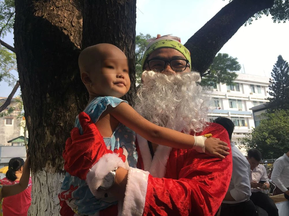 Nghe tin ông già Noel đến, bé Nguyễn Thị Thanh Thảo (ba tuổi, quê ở Sóc Trăng) đang điều trị ung thư máu cách đây ba tháng tại BV rất đỗi vui mừng. Dù tóc em không còn vì hóa chất, hai chân teo yếu không thể đi lại, Thảo vẫn rất hào hứng và nghịch râu ông già Noel khi được chụp hình chung. Bao nỗi đau giày vò do bệnh tật dường như tan biến...