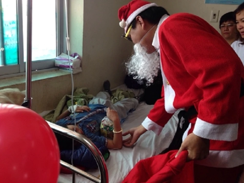 Ông già Noel đến tận giường bệnh tặng quà cho bệnh nhi tại BV Nhi đồng 2. Ảnh: TP