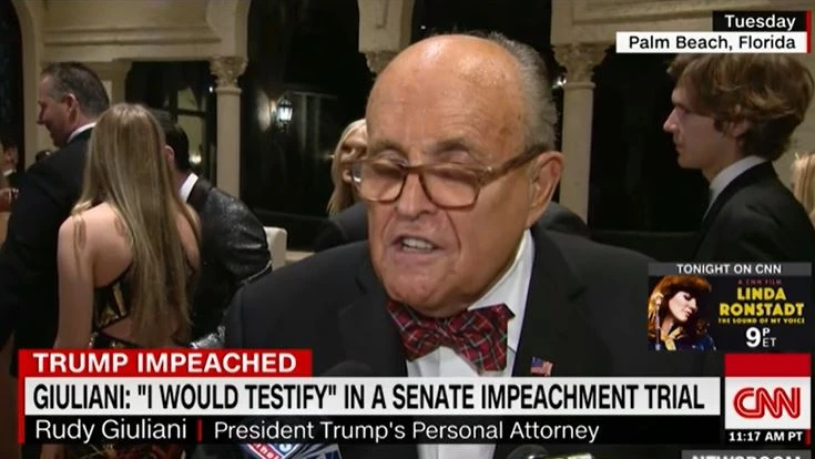 Đài NBC dẫn lời luật sư cá nhân của Tổng thống Donald Trump, Rudy Giuliani, rằng ông sẵn sàng làm chứng tại phiên tòa luận tội tổng thống nhưng vẫn muốn làm đại điện cho thân chủ Trump của mình trong quá trình tố tụng.