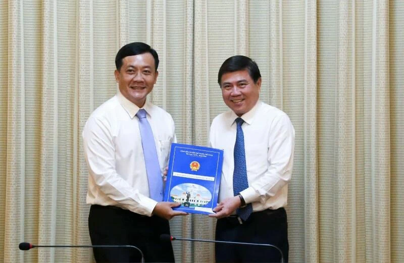 Chiều 30-8, Chủ tịch UBND TP.HCM Nguyễn Thành Phong trao quyết định của UBND TP bổ nhiệm ông Hà Phước Thắng - Trưởng ban Đầu tư và xây dựng khu đô thị mới Nam TP làm chánh Văn phòng UBND TP.HCM.