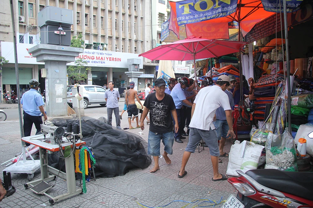 Ở chợ Dân Sinh ở khu vực giao lộ Nguyễn Công Trứ - Yersin (phường Nguyễn Thái Bình), đoàn công tác phát hiện nhiều tiểu thương bày biện hàng hóa, để dù che chiếm hết vỉa hè nên lập biên bản, xử lý.
