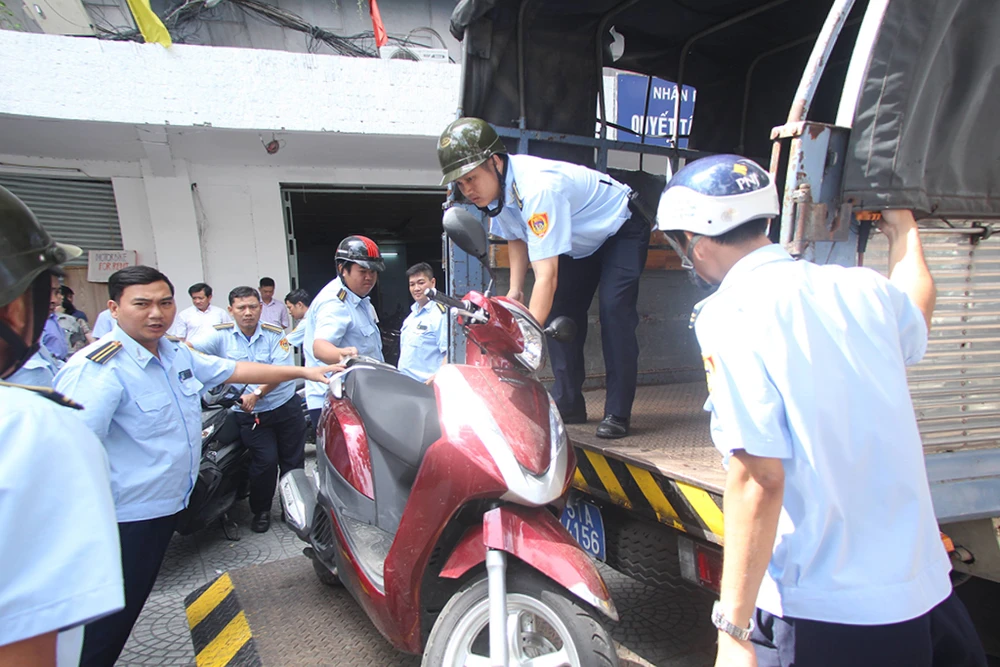 Lực lượng chức năng lập biên bản đưa nhiều xe máy ở chung cư Nguyễn Thái Bình về trụ sở. Ảnh HT