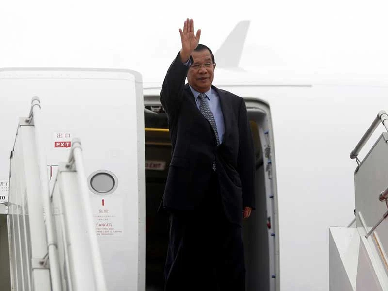 Thủ tướng Campuchia Hun Sen tại sân bay quốc tế Phnom Penh trước khi lên đường sang Trung Quốc ngày 29-11. Ảnh: REUTERS