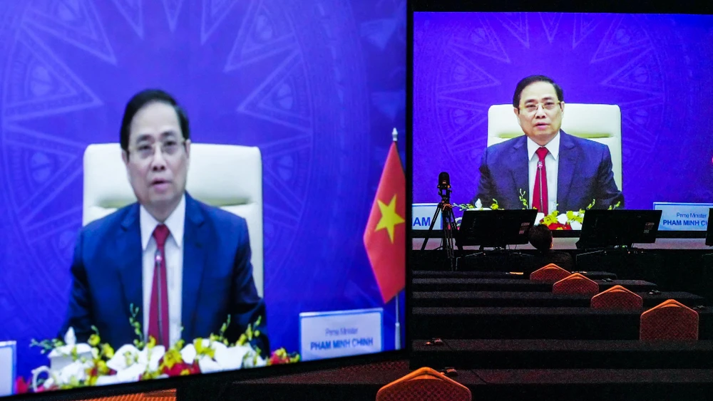 Thủ tướng Việt Nam Phạm Minh Chính phát biểu hôm 20-5 trong Hội nghị quốc tế về Tương lai châu Á lần thứ 26 (trực tuyến). Ảnh: NIKKEI ASIA
