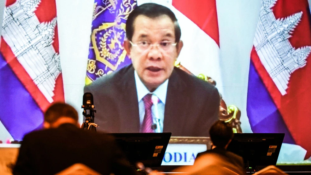 Thủ tướng Campuchia Hun Sen phát biểu hôm 20-5 trong Hội nghị quốc tế về Tương lai châu Á lần thứ 26 (trực tuyến). Ảnh: NIKKEI ASIA