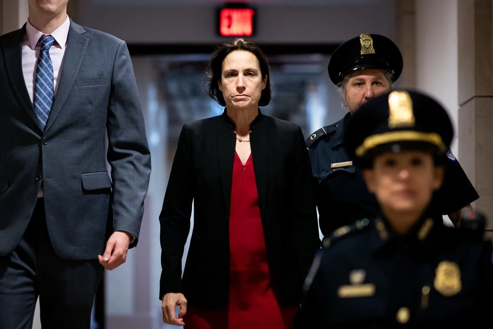 Bà Fiona Hill, cựu Giám đốc Hội đồng An ninh Quốc gia về châu Âu, xuất hiện trong phiên điều trần về bê bối Ukraine ngày 13-10. ẢNh: THE NEW YORK TIMES