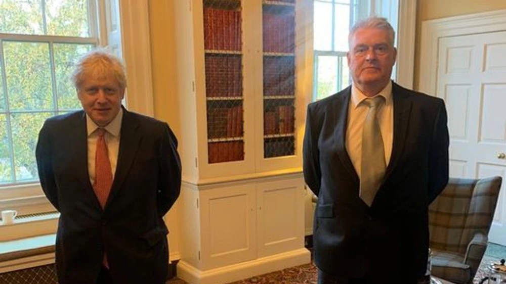 Thủ tướng Anh Boris Johnson (trái) trong cuộc gặp với nghị sĩ Lee Anderson (phải) ngày 12-11 ở dinh thủ tướng. Ảnh: SKY NEWS
