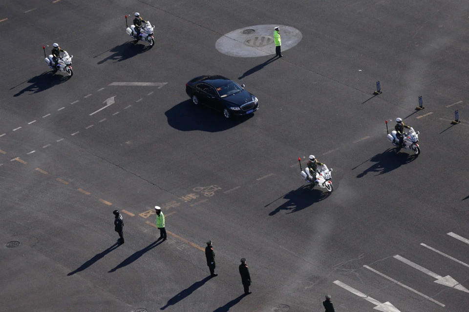 Chiếc xe được cho là chở theo nhà lãnh đạo Triều Tiên xuất hiện với cảnh sát hộ tống trên đường phố Bắc Kinh hôm 8-1. Ảnh: REUTERS