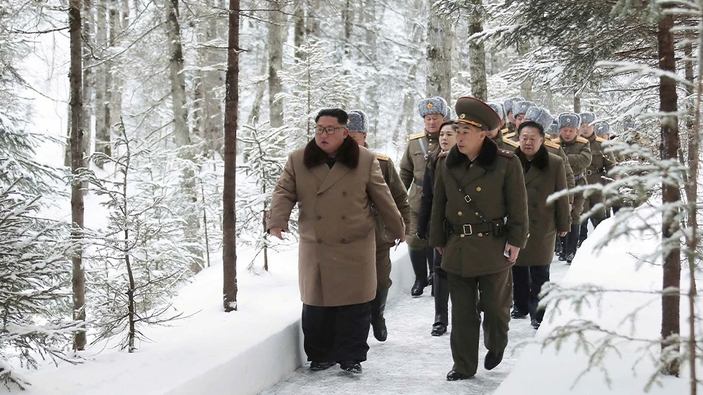 Chủ tịch Kim Jong-un và các tướng lĩnh khảo sát tại cơ sở phòng thủ trên núi thiêng Paektu ngày 4-12. Ảnh: KCNA