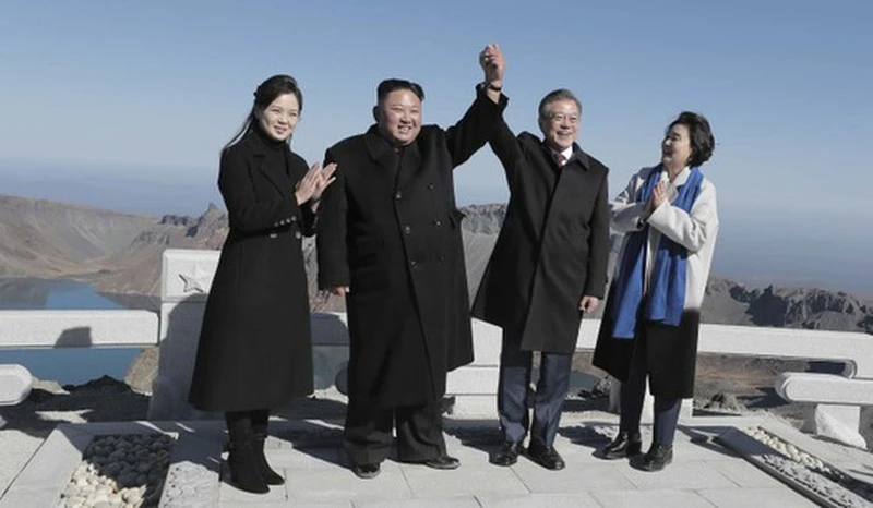Vợ chồng nhà lãnh đạo Triều Tiên Kim Jong-un (trái) và vợ chồng Tổng thống Hàn Quốc Moon Jae-in trên đỉnh núi cao nhất ở bán đảo Triều Tiên Paektu hôm 20-9-2018. Ảnh: YONHAP