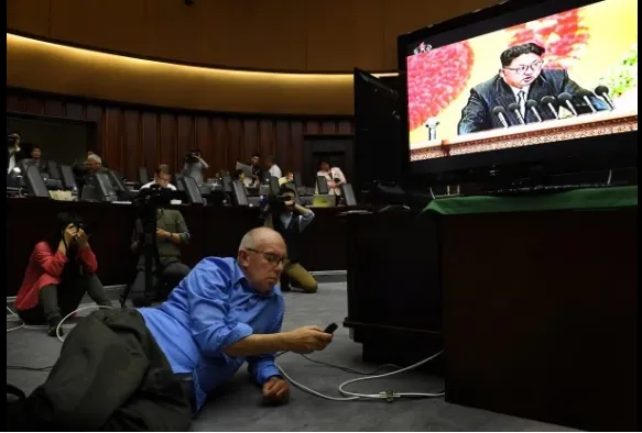 Các nhà báo nước ngoài tập trung tại một khách sạn ở Bình Nhưỡng chờ nghe bài phát biểu của ông Kim Jong-un ngày 8-5. Triều Tiên cho phép nhà báo nước ngoài đến Bình Nhưỡng đưa tin về đại hội Đảng nhưng không được tiếp cận địa điểm hội nghị. (Ảnh: WASHINGTON POST)