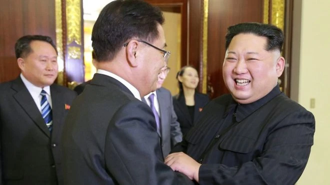 Nhà lãnh đạo Triều Tiên Kim Jong-un chào đón phái đoàn cấp cao Hàn Quốc hôm 5-3. Ảnh: BBC
