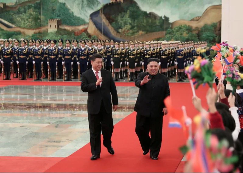 Chủ tịch Trung Quốc chủ trì lễ đón nhà lãnh đạo Triều Tiên tại Đại lễ đường nhân dân Bắc Kinh ngày 8-1. Ảnh: REUTERS