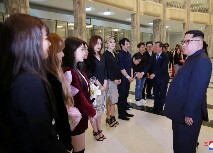 Ông Kim Jong-un trò chuyện với nhóm nhạc Red Velvet, nhóm nhạc nổi tiếng với 4,6 triệu người theo dõi trên Instagram. Ảnh: AP