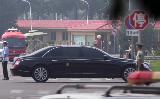 Chiếc xe được cho là chở các quan chức cấp cao Triều Tiên khởi hành từ sân bay quốc tế thủ đô Bắc Kinh ngày 19-6. Ảnh: YONHAP
