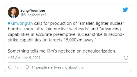 Ông cho rằng Bình Nhưỡng cần phát triển vũ khí hạt nhân chiến lược có thể sử dụng trong chiến tranh hiện đại theo nhiều cách khác nhau, tùy thuộc vào mục tiêu và nhiệm vụ tác chiến, theo Reuters.