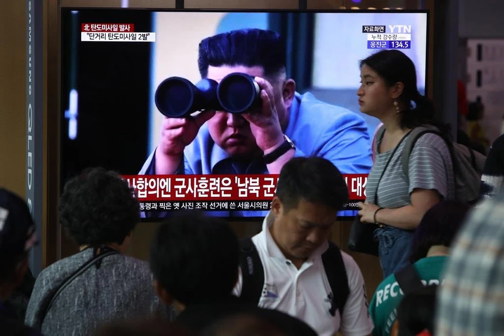 Người Hàn Quốc xem tin tức về việc Triều Tiên đã thử nghiệm một hệ thống tên lửa mới dưới sự giám sát của nhà lãnh đạo Kim Jong-un trên TV. Ảnh: GETTY