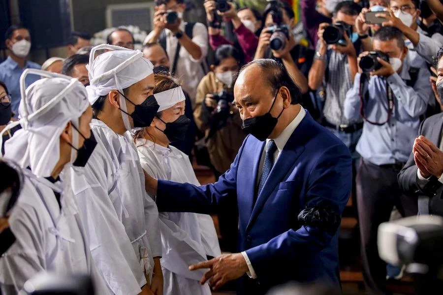 Chủ tịch nước Nguyễn Xuân Phúc chia buồn với gia đình ông Lê Hòa Bình. Ảnh: NGUYỆT NHI