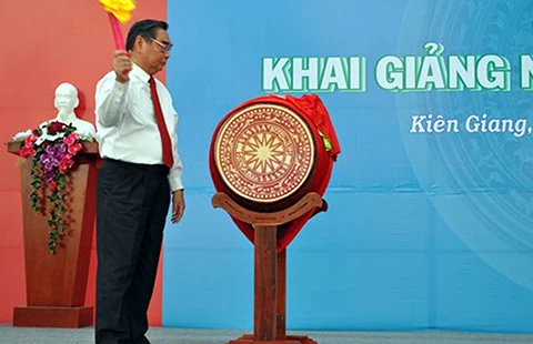 Ông Lê Hồng Anh đánh trống khai giảng năm học mới. Ảnh: K.GIANG