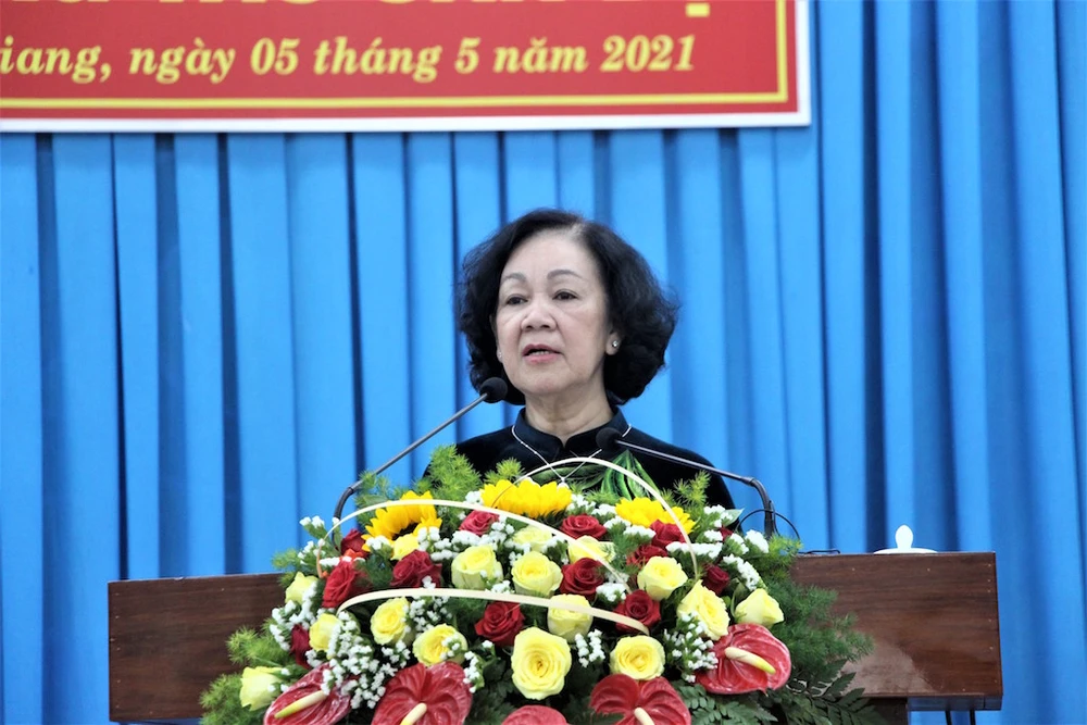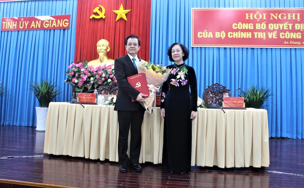Trưởng ban Tổ chức Trung ương Trương Thị Mai trao Quyết định của Bộ Chính trị phân công ông Lê Hồng Quang giữ chức Bí thư Tỉnh uỷ An Giang nhiệm kỳ 2020-2025.