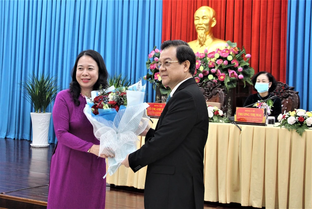 Phó Chủ tịch nước Võ Thị Ánh Xuân, nguyên Bí thư Tỉnh ủy An Giang tặng hoa chúc mừng tân Bí thư Tỉnh ủy An Giang Lê Hồng Quang.