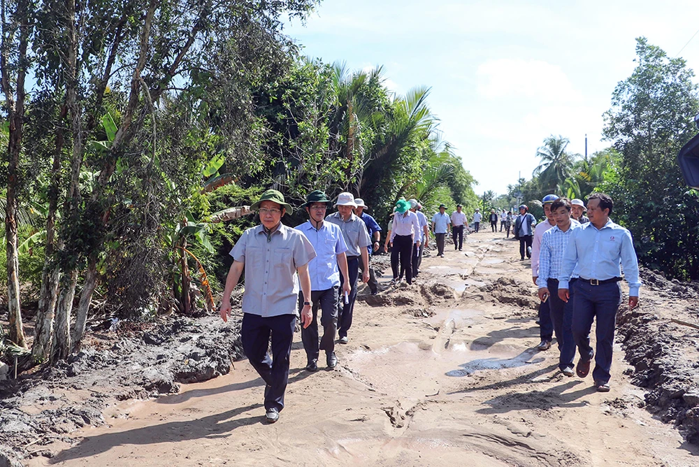 Ông Lê Tiến Châu (bìa trái) trong một lần đi thực tế khảo sát công trình trọng điểm của tỉnh Hậu Giang. Ảnh: CHÂU ANH
