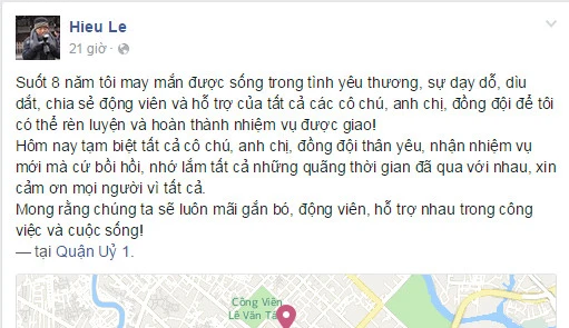 Chia sẻ trên Facebook là cảm xúc tình cảm của tôi khi chia tay một nơi đã công tác gần 10 năm, coi đây là một lời tri ân tới cán bộ, đảnh viên, đến các cô chú, anh chị, đồng đội đã hỗ trợ, dạy dỗ, dìu dắt, chia sẻ động viên trong suốt khoảng thời gian vừa rồi. Ngày về công tác tại quận đoàn 1 chỉ là một sinh viên vừa về nước rất bỡ ngỡ. Qua quá trình công tác, nếu không có sự hỗ trợ của mọi người thì chắc chắn tôi không thể hoàn thành nhiệm vụ. Cảm xúc nhỏ nhoi thôi.