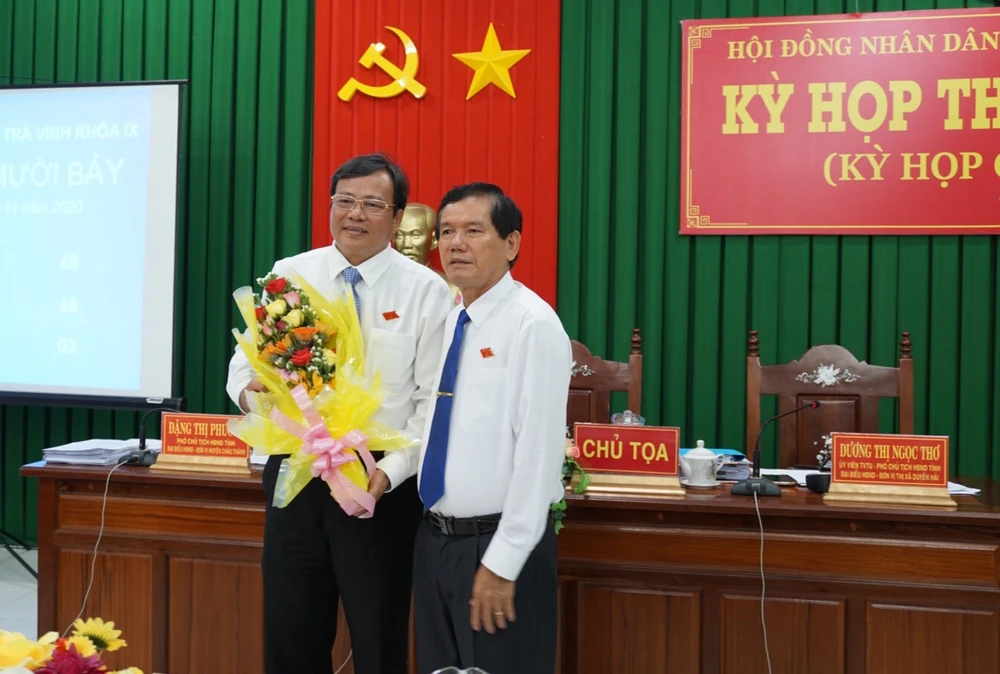 Ông Trần Trí Dũng, Chủ tịch HĐND tỉnh Trà Vinh chúc mừng ông Lê Văn Hẳn được bầu giữ chức Chủ tịch UBND tỉnh Trà Vinh. Ảnh: HD