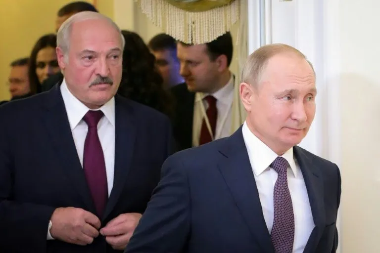 Tổng thống Belarus Alexander Lukashenko (trái) và người đồng cấp Nga Vladimir Putin. Ảnh: YAHOO NEWS