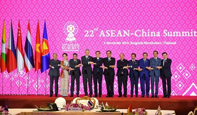 Các lãnh đạo ASEAN và Thủ tướng Trung Quốc Lý Khắc Cường (thứ năm từ trái sang) chụp ảnh chung trong hội nghị ASEAN-Trung Quốc lần thứ 22, trong khuôn khổ kỳ Hội nghị cấp cao ASEAN lần thứ 35 ở Bangkok (Thái Lan) ngày 3-11. Ảnh: AFP