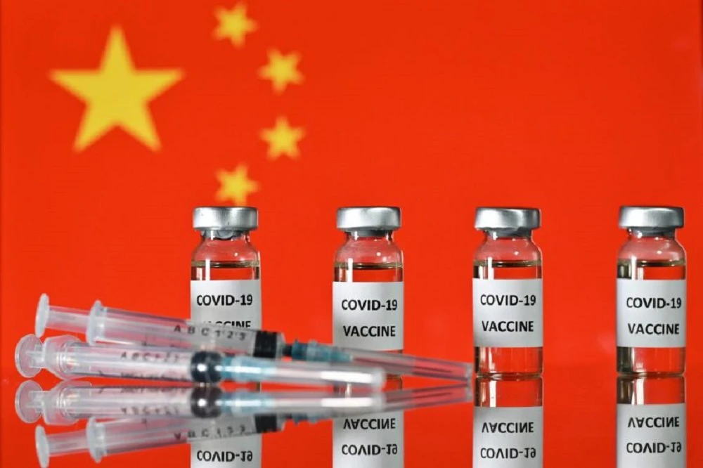 Những lọ vaccie ngừa COVID-19 đặt phía trước quốc kỳ Trung Quốc. Ảnh: SCMP