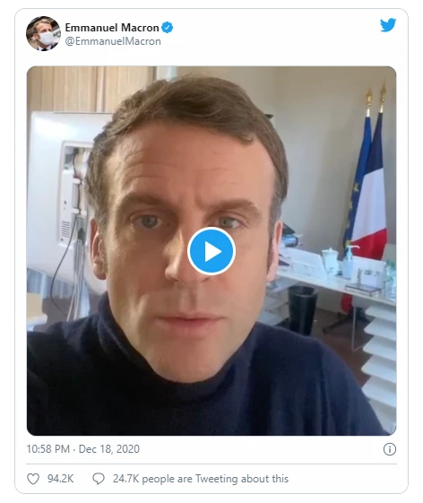 Hãng tin Sputnik ngày 19-12 dẫn lời Tổng thống Pháp Emmanuel Macron cho rằng việc ông nhiễm COVID-19 là do "bất cẩn" và "thiếu may mắn”, đồng thời kêu gọi người dân giữ an toàn.