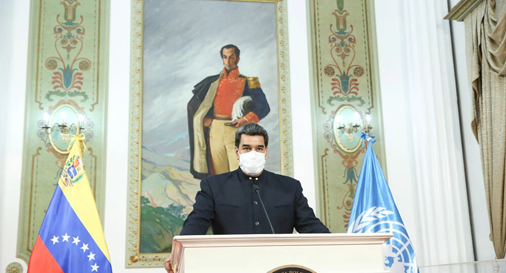 Tổng thống Venezuela Nicolas Maduro đeo khẩu trang và phát biểu tại cuộc họp trực tuyến với Liên Hợp Quốc. Ảnh: SPUTNIK