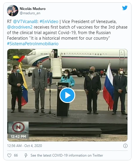 Tổng thống Maduro đưa tin về việc Phó Tổng thống Venezuela Delcy Rodriguez nhận được lô vaccine ngừa COVID-19 đầu tiên của Nga. Ảnh: TWITTER