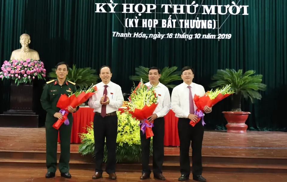Bí thư Tỉnh ủy, Chủ tịch HĐND tỉnh Thanh Hóa - ông Trịnh Văn Chiến (thứ hai từ trái qua) tặng hoa chúc mừng những người được bầu làm ủy viên UBND tỉnh Thanh Hóa nhiệm kỳ 2016-2021.