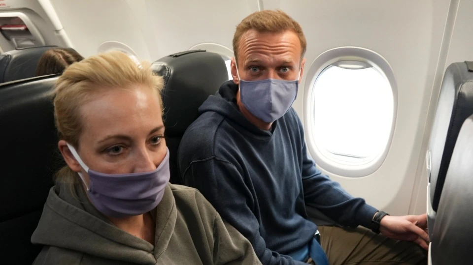 Ông Navalny và vợ trên máy bay tại sân bayBerlin Brandenburg (Đức) chuẩn bị về Nga hôm 17-1. Ảnh: Mstyslav Chernov/AP