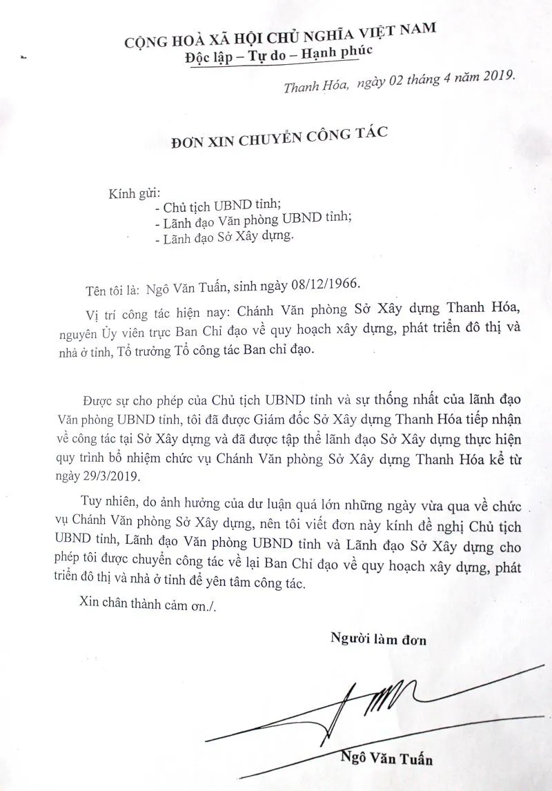 Đơn xin chuyển công tác của ông Ngô Văn Tuấn với lý do ảnh hưởng của dư luận quá lớn nên viết đơn xin chuyển công tác về Ban chỉ đạo quy hoạch xây dựng thuộc UBND tỉnh Thanh Hóa.