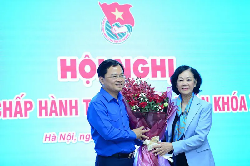Ủy viên Bộ Chính trị, Bí thư Trung ương Đảng, Trưởng ban Dân vận Trung ương Trương Thị Mai tặng hoa chúc mừng tân Bí thư thứ nhất Trung ương Đoàn Nguyễn Anh Tuấn. Ảnh: VGP