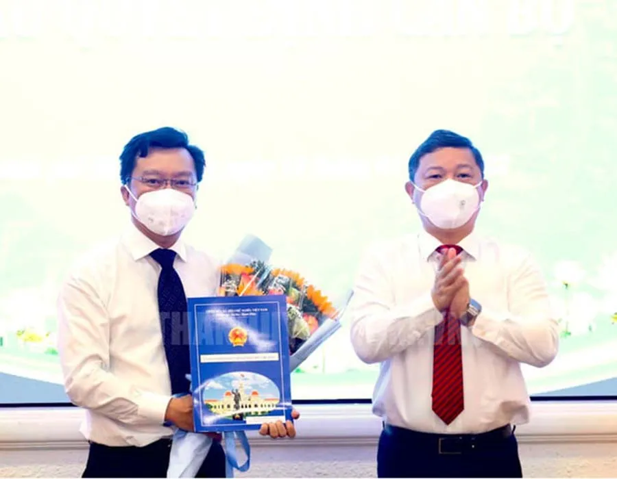 Ông Dương Anh Đức, Phó Chủ tịch UBND TP.HCM, trao quyết định cho ông Nguyễn Bảo Quốc (trái). Ảnh: Thành ủy TP.HCM