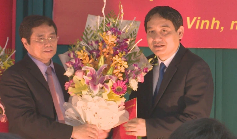Ông Phạm Minh Chính - Ủy viên Bộ Chính trị - Bí thư Trung ương Đảng - Trưởng ban Tổ chức Trung ương đã trao quyết định, tặng hoa chúc mừng ông Nguyễn Đắc Vinh giữ chức Bí thư Tỉnh ủy Nghệ An.