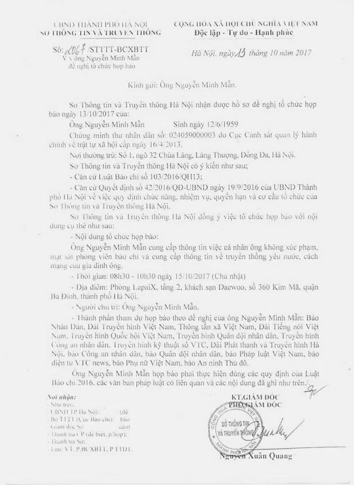 Theo giấy phép tổ chức họp báo được cấp, buổi họp báo do ông Mẫn tổ chức sẽ diễn ra vào sáng mai (15-10), tại khách sạn Daewoo (Hà Nội).