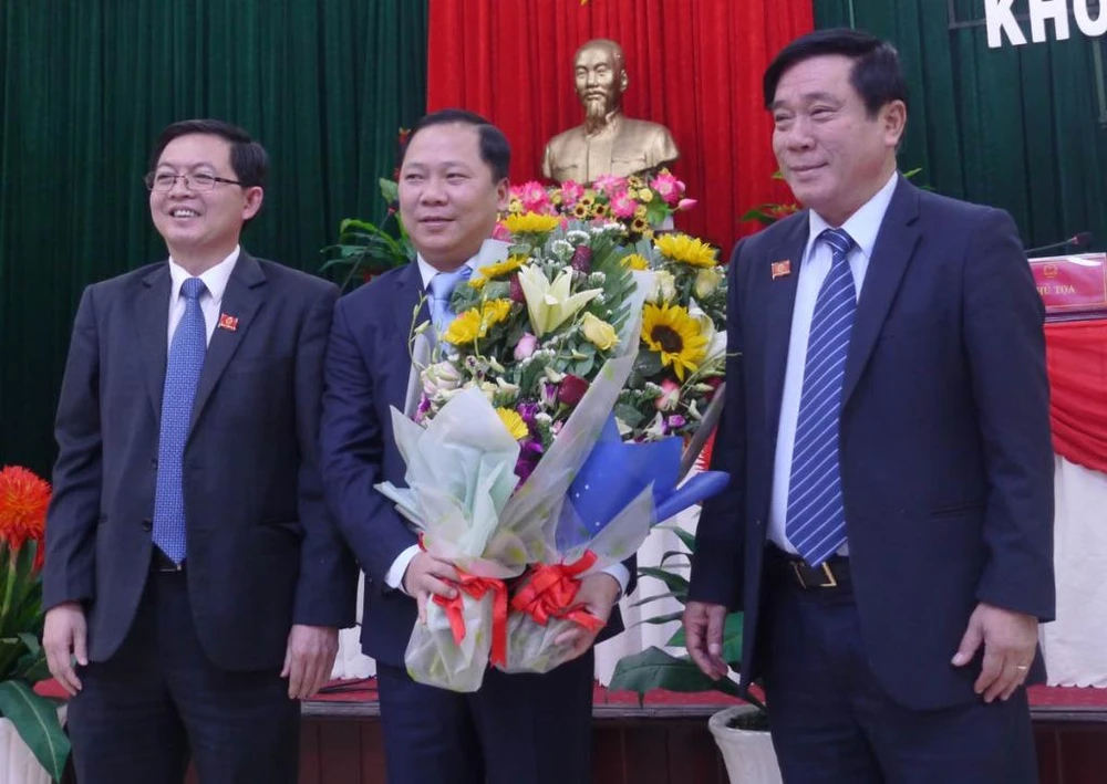 Ông Nguyễn Thanh Tùng, Bí thư Tỉnh ủy Bình Định (phải) và ông Hồ Quốc Dũng, Chủ tịch UBND tỉnh Bình Định, tặng hoa chúc mừng tân Phó chủ tịch UBND tỉnh Nguyễn Phi Long